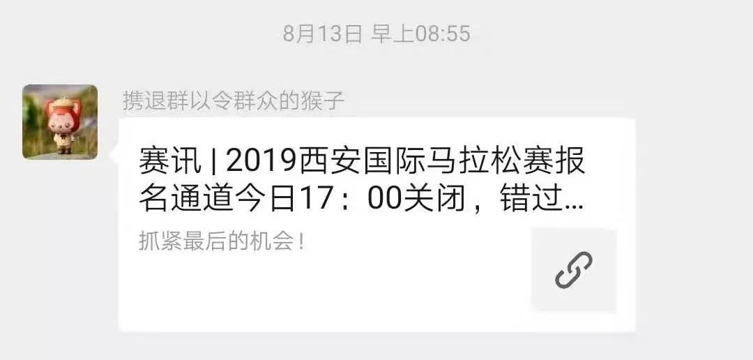 其实我是不知道西安国际马拉松什么时候报名,什么时候比赛的,但是8月13日猴哥(现任一哥,当时还不是一哥)在群里发了个报名链接,说是当天就要结束报名了。