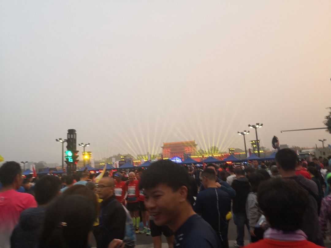 7:30起跑枪响起,然而E区连点蠕动都没有,这时又下起了雨,没带雨衣,环顾四周,想找件别人扔下的雨衣,结果想多了。淋雨等啊等,队伍终于蠕动了,雨还没停,越下越大了。刚好旁边护栏挂了个雨衣,上前揪了上边的帽子套到了头上,看了看别人的雨衣,我的帽子好像反了,管他呢,能挡雨就行。