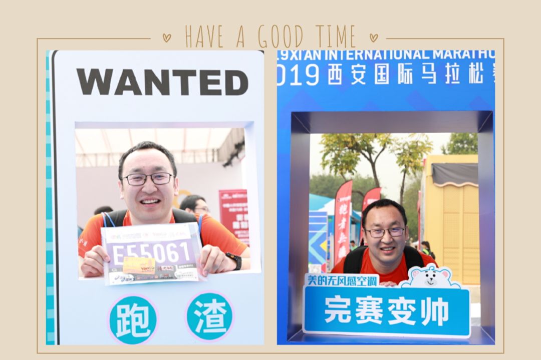 参赛包里各种广告,卖房子的、卖车的、卖空调的、卖保险的,感觉完全就是置业安家一条龙,来了把你留西安。虽然群里老早就发了薅羊毛攻略,但是等我到了羊跟前只有了羊皮,只能薅羊皮了。遇上了免费喷印,傻乎乎的排队,结果到了地方,说是只能给白颜色的地方喷印。看了看参赛服,只有脖子附近是白色的,但是也不能喷个大金链子吧,白排了。还是去拍照算了,起码标签不会拿错,拍了个自己身份和自己愿望的照片,感觉我脸有些白。