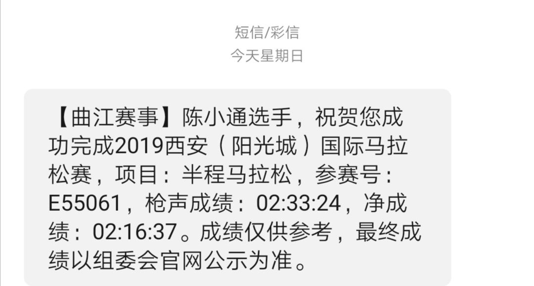 提着完赛袋子,顺着流程做了拉伸,其实就是滚了滚小腿。坐上摆渡车回了到了地铁站,下车的时候总能听到呻吟。群里已经有人贴出半马成绩了,但我还是没有收到短信,难道成绩无效?这时对面一兄弟说你去拦截信息里找找,过了终点就来成绩短信了,结果真在拦截短信里。