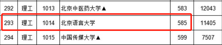 理工类,北京语言大学投档线为585分,分数线超过了湖南师范大学、北京林业大学、长安大学等211高校;