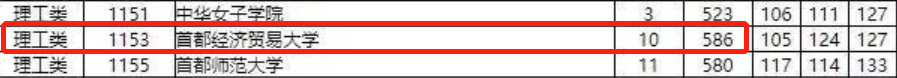 理工类,首都经济贸易大学投档线为586分,分数线超过合肥工业大学、中国地质大学(武汉)等211高校;