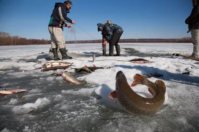 冬季黑龙江完全冰封,凿开冰面捕鱼也是这里的一大特色。