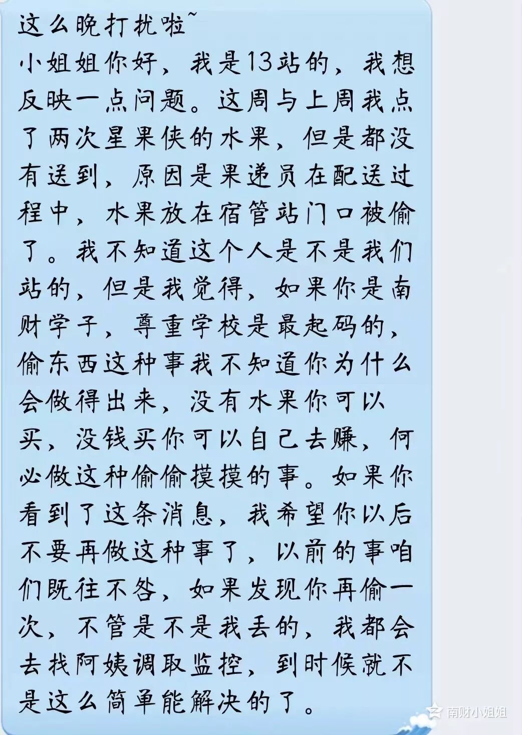 反映水果放在宿管站门口被偷了