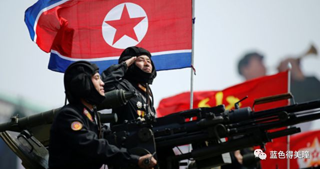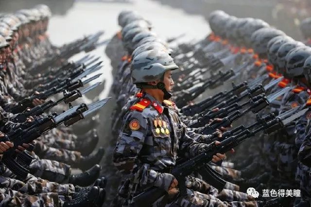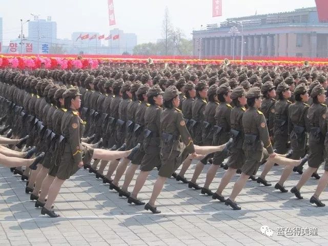图为朝鲜阅兵式上的女兵方队,腿踢得很高,很有气势,巾帼不让须眉。