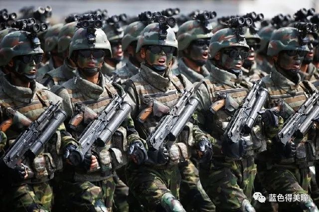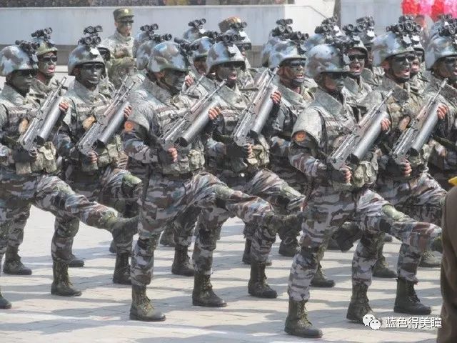 图为朝鲜阅兵式上的另一支特种兵方队,服装颜色说明这从属于陆军。两型特种部队看起来很有“杀气”,但是武器装备水平着实一般,具备夜战能力。