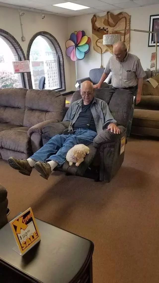 网友表示自己这次是真的吃醋了,这个一辈子都是钢铁直男的老人,竟然带着一只狗逛了好几家店,直到能找到一个狗狗躺上去很舒服的沙发!