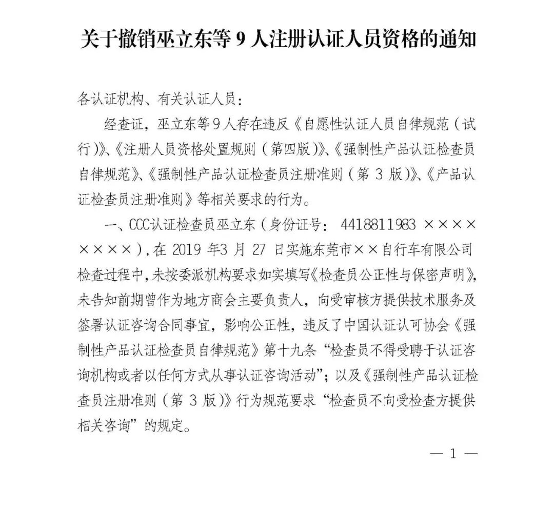 据中国认证认可协会消息,经查证,巫立东等9人存在违反《自愿性认证人员自律规范(试行)》、《注册人员资格处置规则(第四版)》、《强制性产品认证检查员自律规范》、《强制性产品认证检查员注册准则(第3版)》、《产品认证检查员注册准则》等相关要求的行为。