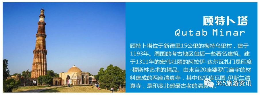 【古特伯高塔qutab minar】(外观)世界文化遗产,建于1193 年,是印度的第一位穆斯林国王为了庆贺战胜当地印度教徒而修建的世界上最高的砖砌高塔,由红砂石和大理石建成,高达73 米,已有近1000 年历史,这种高塔建筑为何保存的如此完好至今仍是个谜。这座高塔是典型印度-伊斯兰风格建筑,镌刻阿拉伯文的《古兰经》经文和各种花纹图案。关于它来历的故事有5 个版本,但最令人信奉的说法是德里的第一位伊斯兰统治者为了显示对印度教徒的征服而修建,为此他下令拆除了27座印度教寺庙,用寺庙的砖瓦修建了高塔下的清真寺,你甚至能看到清真寺上的墙壁上仍保留印度教的装饰花纹——这样的宗教冲突仍不时地在当今的印度社会中上演。