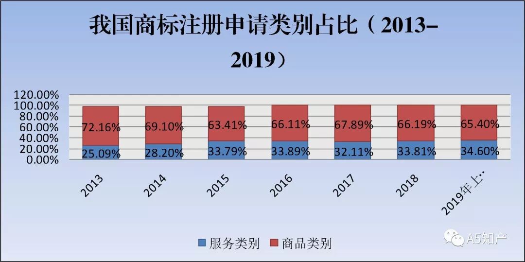 2019 年上半年我国 GDP 产业结构数据显示,第三产业占比为 54.9%,比上年同期增长 7%;世界知识产权组织发布的《2018 世界知识产权指标》显示,世界范围服务类别商标申请占比约 37%;这也表明我国服务类别商标注册申请量还有增长潜力和空间。