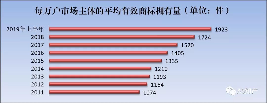 (一)市场主体平均有效商标拥有量稳步提升。截至2019 年6 月,商标累计申请量3865.1 万件,累计注册量2582.3万件,有效注册商标量 2274.3 万件,平均每 5.2 个市场主体拥有一个有效商标,我国每万户市场主体的平均有效商标拥 有量从 2011 年的 1074 件增长到当前的 1923 件,市场主体的商标意识不断增强。
