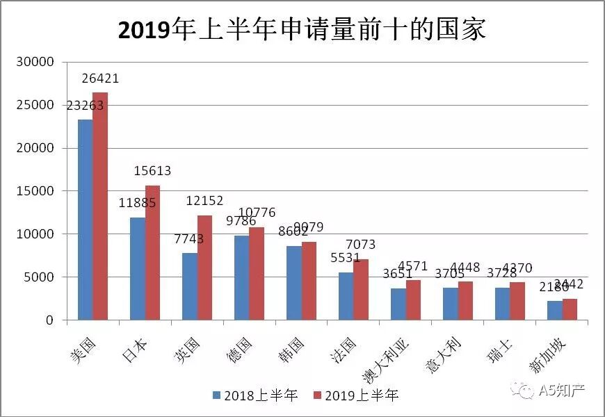 (五)外国申请人商标申请量继续保持增长态势。2019年上半年,国外申请人在华商标申请量达 12.7 万件,同比增长 15.4%,其中直接申请 90691 件,马德里申请 36632(类) 件。申请量前十的国家依次为美国、日本、英国、德国、韩国、法国、澳大利亚、意大利、瑞士和新加坡,申请量共计96945 件,占同期国外申请总量的 76.1%,且每个国家与去年同期相比均呈增长态势,平均同比增长率达 22%,其中增长最快的为英国(同比增长 56.9%)。相关数据增长反映出我国市场对国外企业持续保持较高的吸引力,同时也说明我国知识产权制度及营商环境得到国外企业广泛认可,国际社会对我国知识产权保护的信心不断增强。