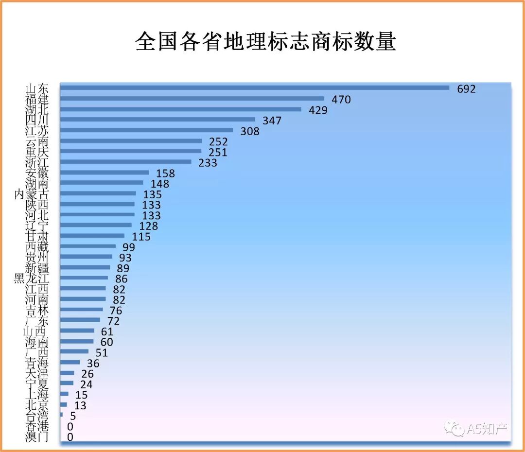 截至 2019 年 6 月,商标局共核准注册 5093 件地理标志商标,其中国外地理标志商标 191 件。全国地理标志累计注册量最多的前 5 个省依次为山东省(692 件)、福建省(470件)、湖北省(429 件)、四川省(347 件)和江苏省(308 件),合计占全国的 44.1% 。国外地理标志商标申请量排名前三的国家依次为法国(134 件),意大利(22 件)、美国(14 件)。