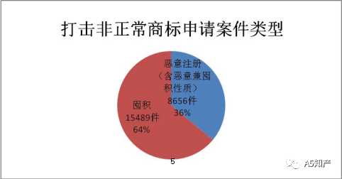 (二)商标审查、异议、评审、撤三程序在打击商标恶意注册中的作用持续加强。2019 年 4 月 1 日起,商标局连续三个月共计驳回非正常商标申请 24145 件,约占同期审查量的 1.2%,约占同期驳回量的 4.2%。其中,恶意注册(含恶意兼囤积性质)性质案件 8656 件,约占 36%;囤积性质案件 15489 件,约占 64%。
