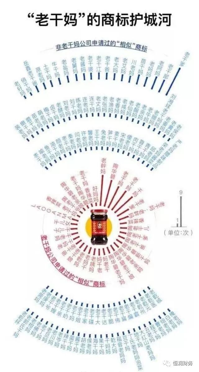 火遍国内外的辣椒酱品牌“老干妈”公司曾注册过192个商标,诸如“老幹妈”、“老干爹”、“老姨妈”等衍生词都包含在内,核心品牌“老干妈”有着牢固的“商标护城河”。