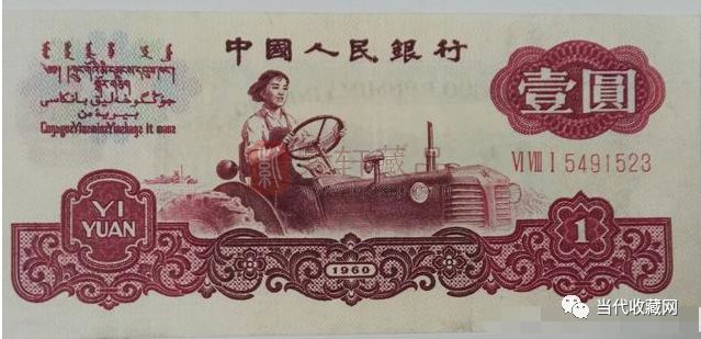 第四朵金花是1960年1元,正面是“女拖拉机手”图。这枚1元券分为五星水印和五星夹古币混合水印两种,这枚钞票开创性地采用了高标准高质量的“五星夹古币”混合水印。因此,1元“女拖拉机手”凭借着略带“绝版水印”味道的特殊水印设计成为钞中珍品,升值势头咄咄逼人。