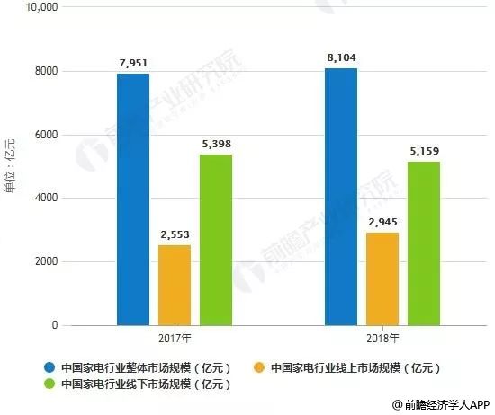 根据全国家用电器工业信息中心数据统计,2018年,中国家电市场规模达到8104亿元,同比增幅仅为1.9%。其中,线上市场零售额为2945亿元,同比增长15.3%;线下市场零售额为5159亿元,同比下滑4.4%。
