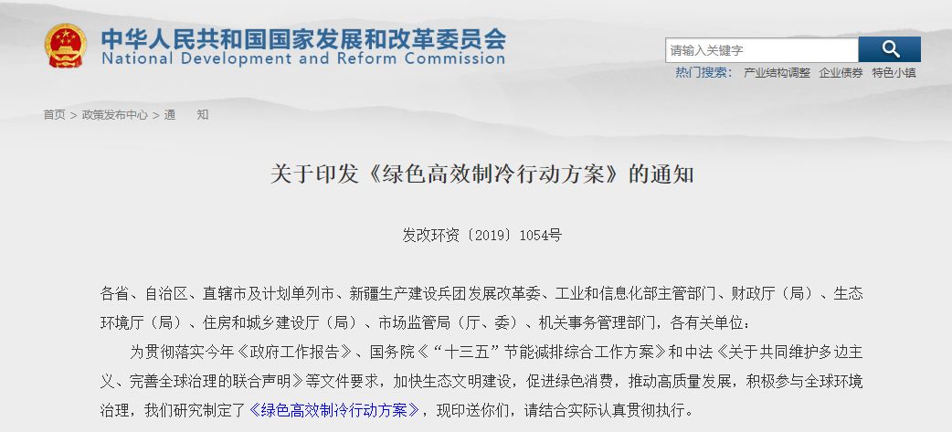 2019年6月13日,国家发改委、工信部、财政部等7部委联合印发《绿色高效制冷行动方案》。