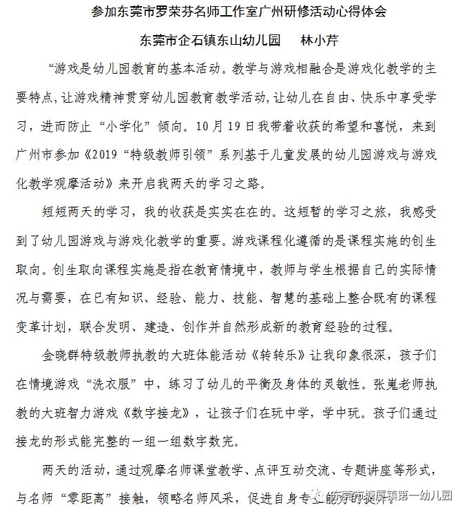 为进一步贯彻落实《纲要》与《指南》精神,探索课程游戏化背景下如何有效开展游戏化教学并引导教师关注幼儿发展的核心经验,提高游戏教学活动有效性。2019年10月19日至20日,东莞市罗荣芬名师工作室组织全体成员参加由北京学前教育协会教师培养专业委员会、北京中幼教育科技研究院,在广州市举办的“特级教师引领”系列——“基于儿童发展的幼儿园游戏与游戏化教学观摩”活动。