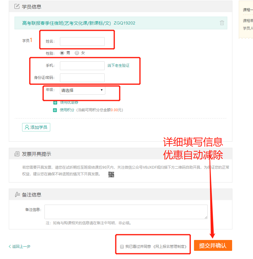 E. 汇款后提交信息:学员姓名、性别、身份证号、省份、家长移动电话、文/理、课程期次