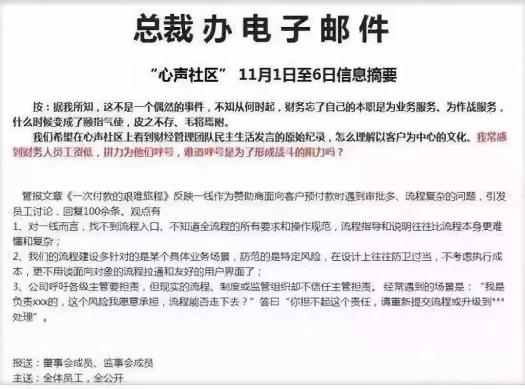 2015年,华为内刊上有员工指出华为内部的财务付款、审批流程多且复杂、入口难找、主管对财务风险不愿担责等问题。