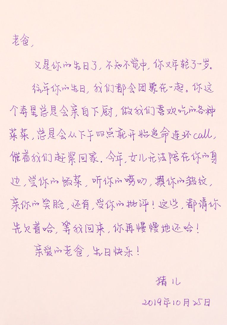 往年你的生日,我们都会团聚在一起。你这个寿星总是会亲自下厨,做我们喜欢吃的各种菜菜,总是会从下午四点就开始追命连环call,催着我们赶紧回家。今年,女儿无法陪在你身边,尝你的饭菜,听你的唠叨,摸你的皱纹,亲你的笑脸,还有受你的批评!这些,都请你先欠着哈,等我回来,你再慢慢地还哈!