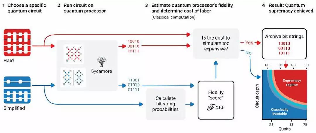 在实验中,谷歌首先运行了 12 到 53 个量子比特的随机简化电路,以保持电路深度恒定。然后,他们利用经典模拟来检验量子计算机的性能,并与理论模型进行对比。在证实系统能够正常工作后,谷歌运行了电路深度不断增加的 53 量子比特的随机硬件电路,直到达到经典模拟不可行的点。