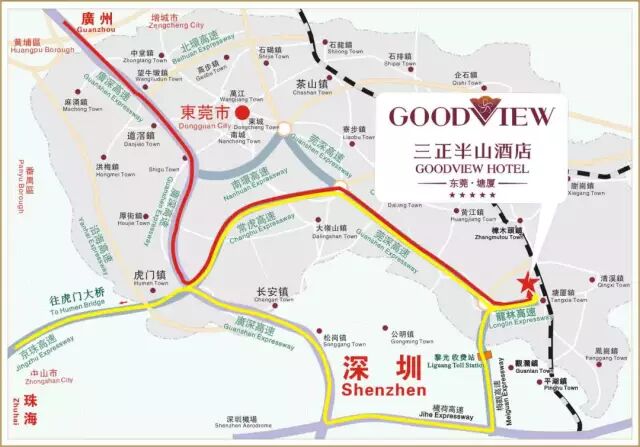 广州市内------广深高速------虎岗高速------莞深高速------塘厦出口(转龙林高速)------塘厦中心区------迎宾大道(第一个红绿灯转左到达酒店)