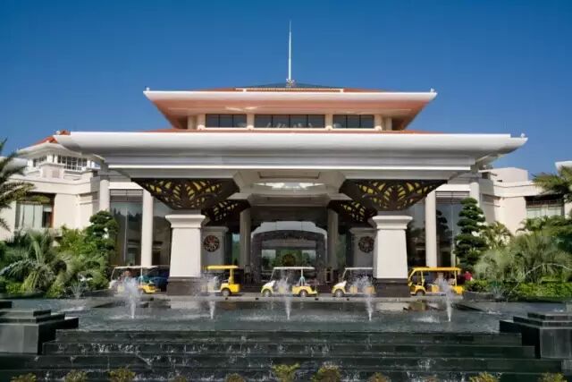 远观水平线,有人造沙滩,椰树成荫,与山、与水