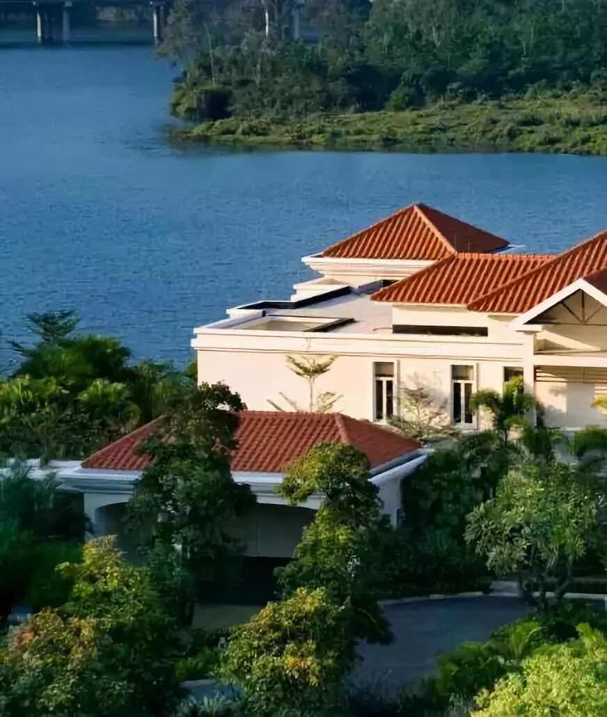 酒店被青山绿水所环绕,且居于水中央,无论是近看