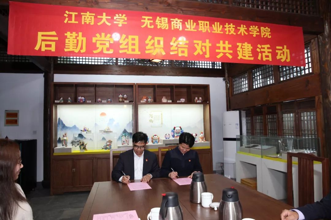 江南大学后勤保障系统党委书记卢长征、无锡商业职业技术学院后勤党总支书记李桂萍在双方学校领导的共同见证下签订了后勤党组织结对共建协议
