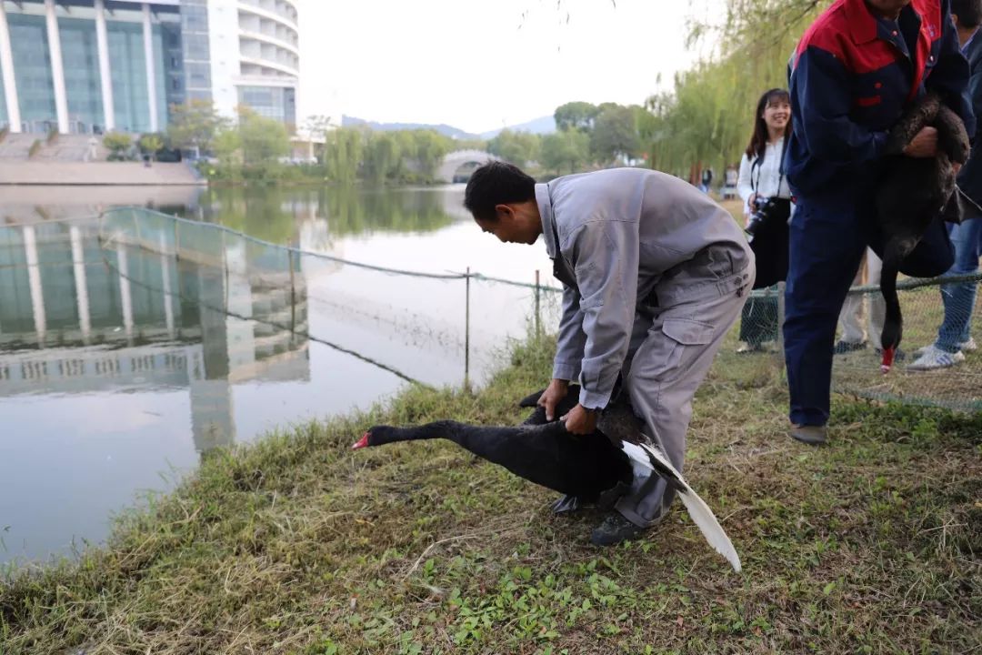 江南大学副校长田备代表江大向我校赠送校园生态文明建设“友谊使者”——黑天鹅