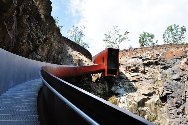 深潭区则是矿坑花园的核心,其前身就是辰山采石场的遗迹,围绕这个面积达10000平方米的人工深潭,设计师创造出了一个由浇注的钢桶、贴合悬崖的钢栈桥、人工“一线天”及木浮桥组成的游线。行走在矿坑之中,游人可以近距离感受矿坑采石场带来的视觉冲击,并体验人工瀑布飞流直下的壮观气势。