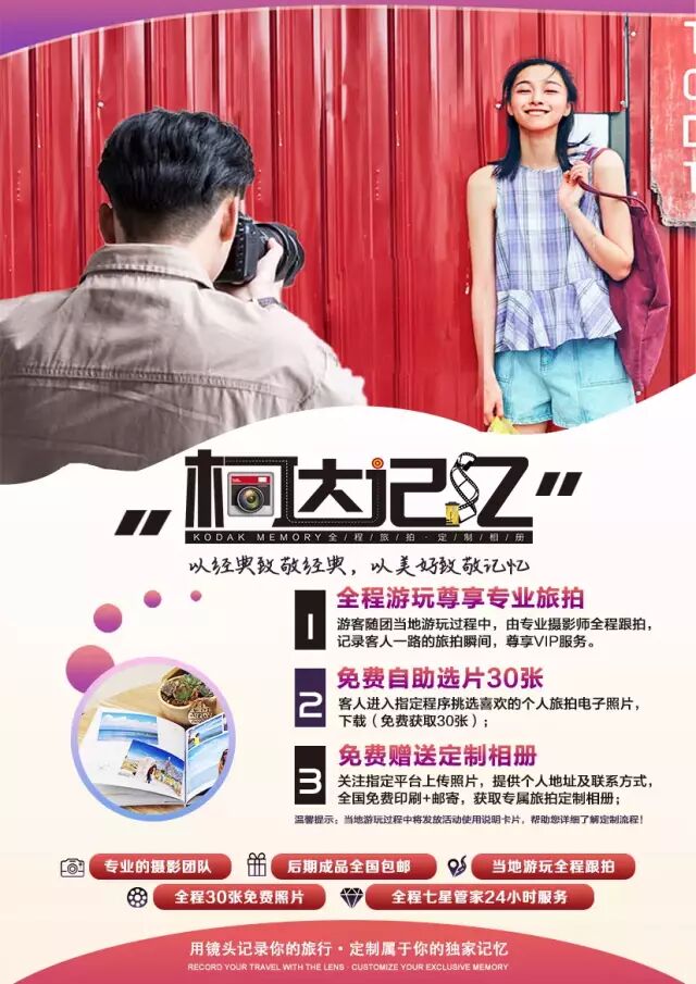 ◎ 体验5:专业摄影师全程旅拍,免费赠送自助选片30张,免费赠送个人专属定制相册!