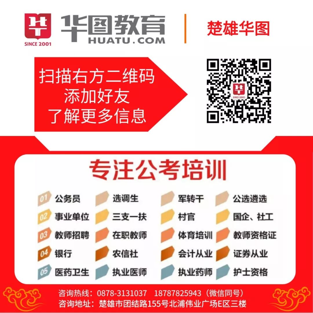 ?微信公众号:楚雄华图(cxhuatu)? 定期推送招考信息,备考指导,讲座安排等诸多优质内容 电话0878-3131037 18787825943(微信同号) 地址:楚雄市团结路155号北浦伟业广场E区三楼