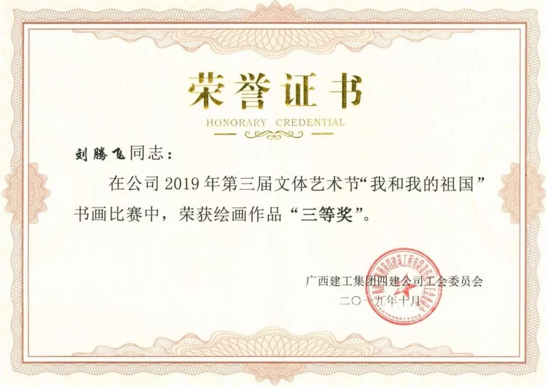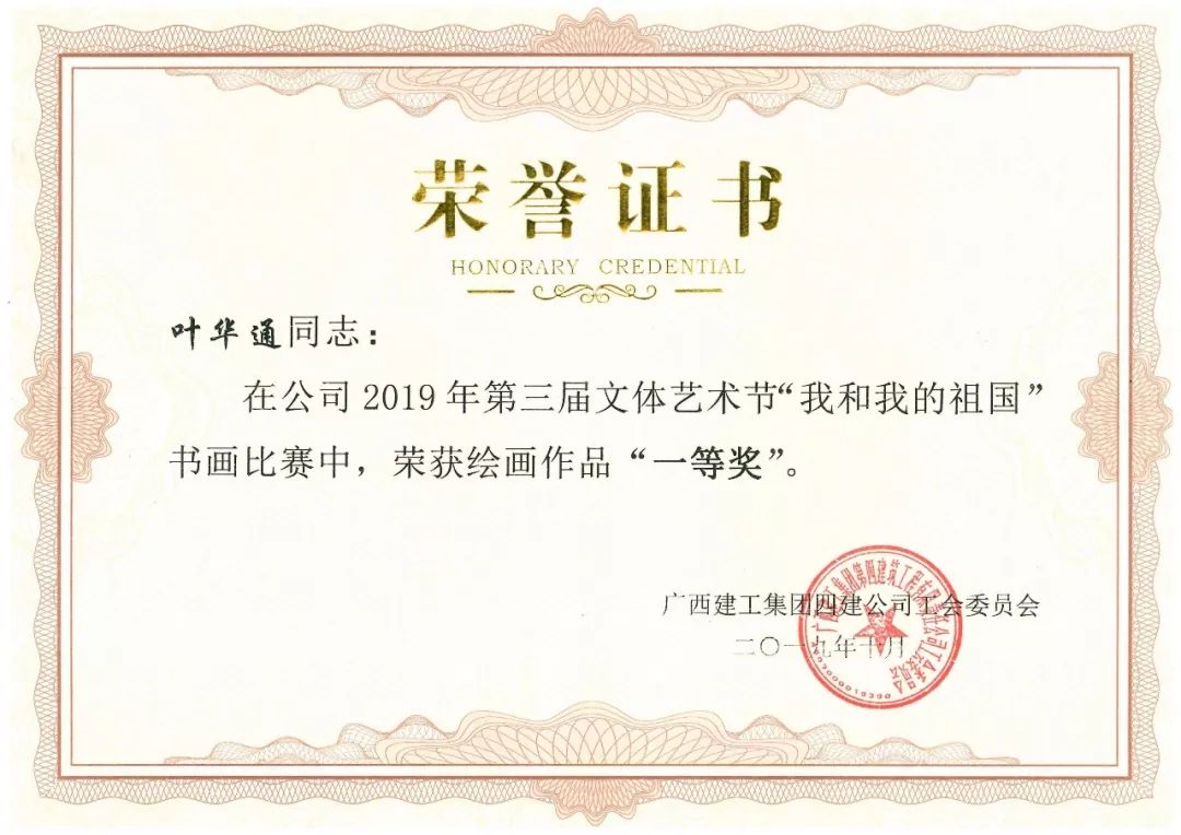 书画比赛:叶华通的色彩画《脚手架上的舞者》获得绘画比赛一等奖;刘腾飞的国画《花鸟香闻》获得三等奖。征文比赛:刘腾飞的《我和我的故乡》获得三等奖。