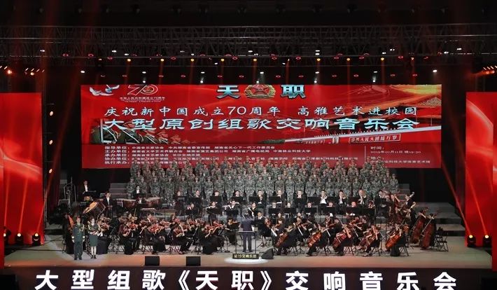 10月11日晚,“拥抱新时代,青春献国防”——庆祝新中国成立70周年大型原创组歌交响音乐会《天职》以“高雅艺术进校园”的形式在我校体育艺术馆举行首演。此次活动由省文联、省演艺集团公司、省广播电视局、中南林业科技大学共同主办,省音协、长沙交响乐团承办。学校师生以及来自社会各界的4200余名观众现场聆听。