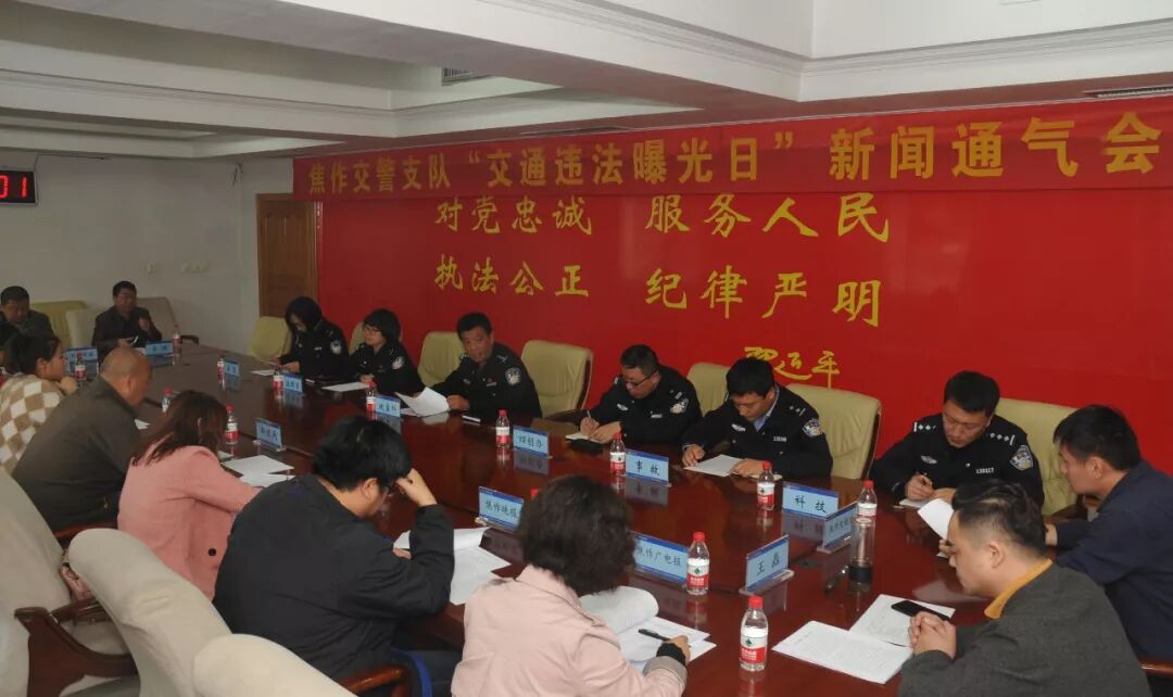 2019年10月25日下午,焦作交警支队召开“交通违法曝光日”新闻通气会,交警支队各相关部门主要负责人,中国网、河南电视台、东方今报、大河网、焦作晚报、焦作电视台、焦作交通旅游广播电台、焦作广电报等媒体代表和部分网友代表参加了会议。
