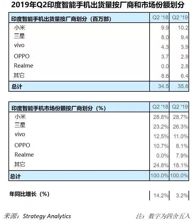 具体来说,2019年Q3印度智能手机市场份额:排名前五名依次为小米26%(同比下降1%),三星20%(同比下降3%),vivo 17%(同比增长7%),realme 16%(同比暴增13%),OPPO 8%(保持不变),Others份额继续暴跌。