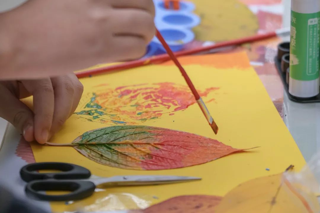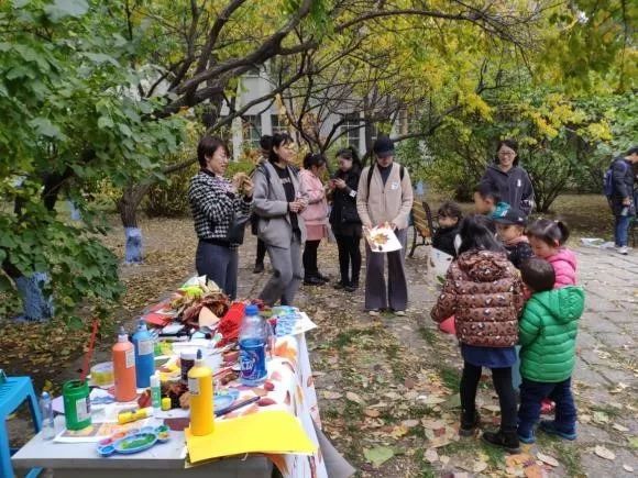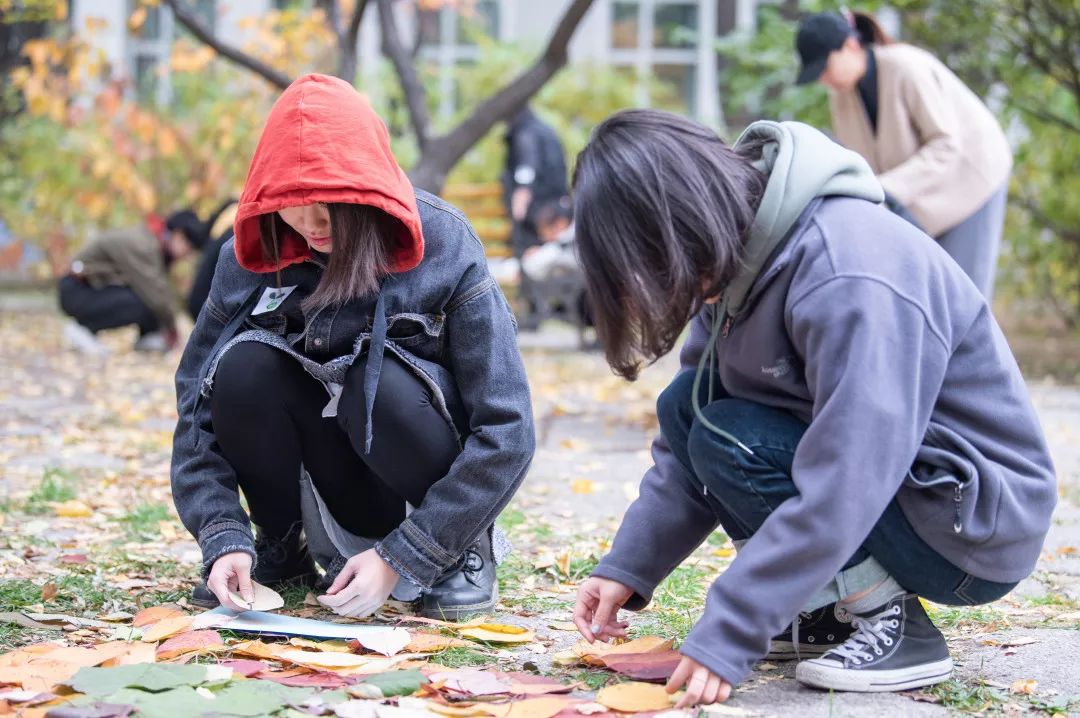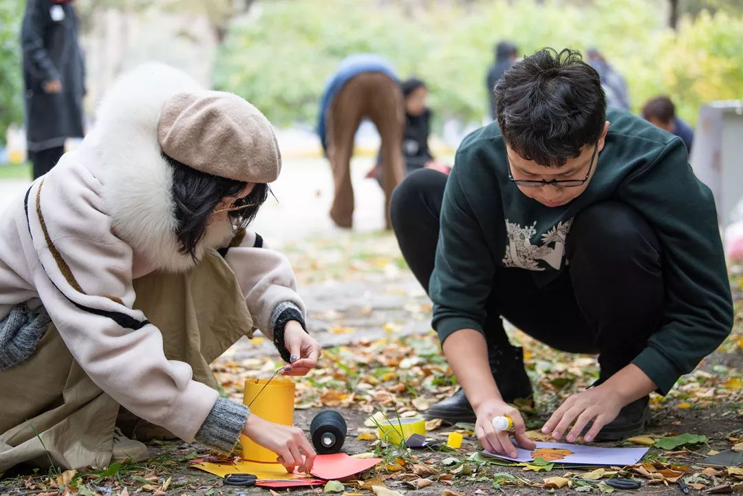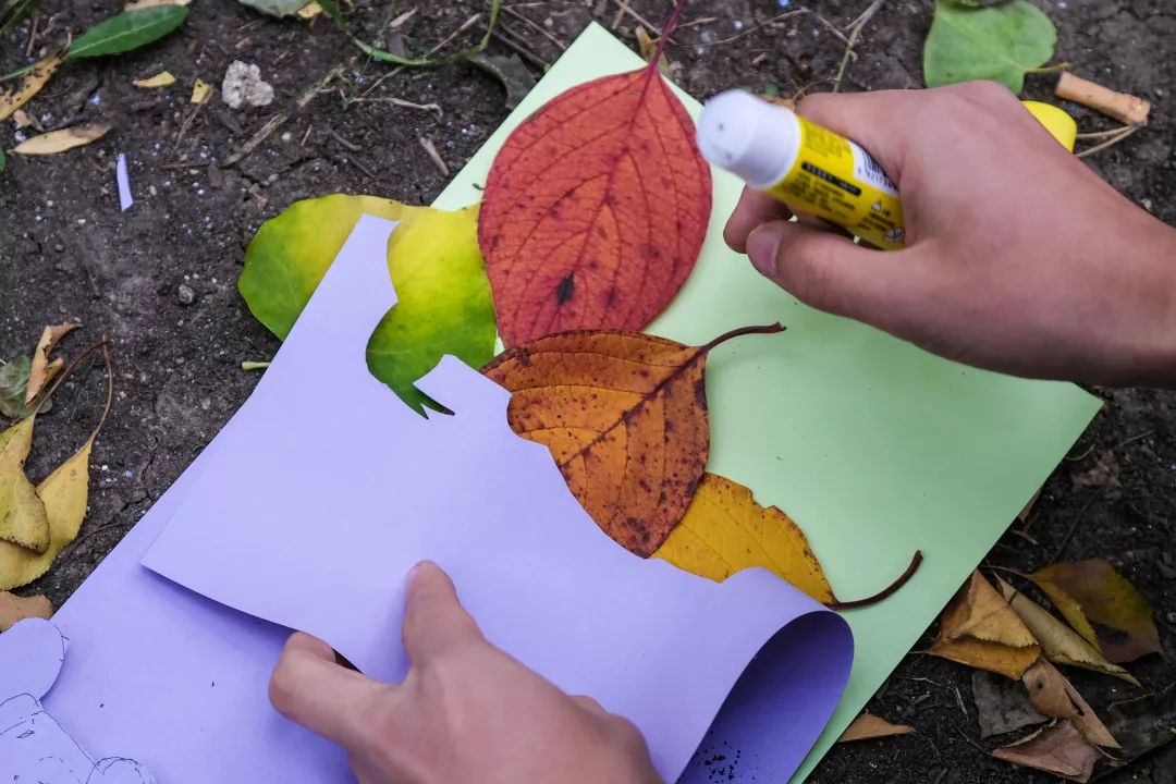 大家在场地里收集落叶,用卡纸、颜料、针线等材料纷纷开始创作。