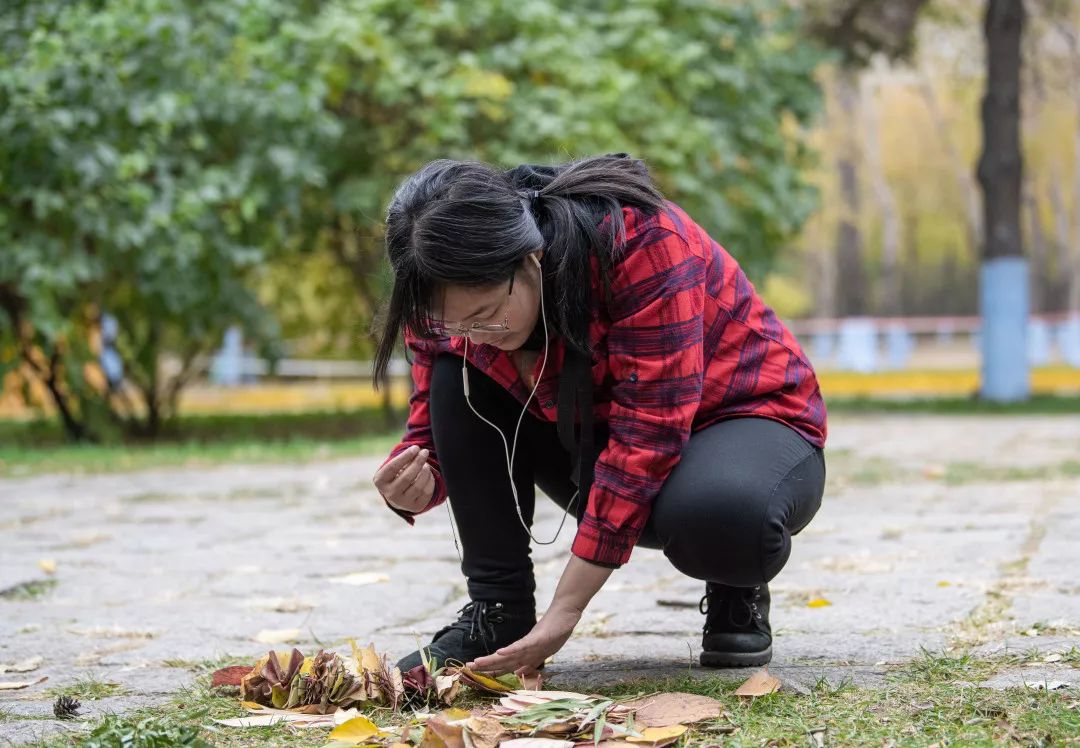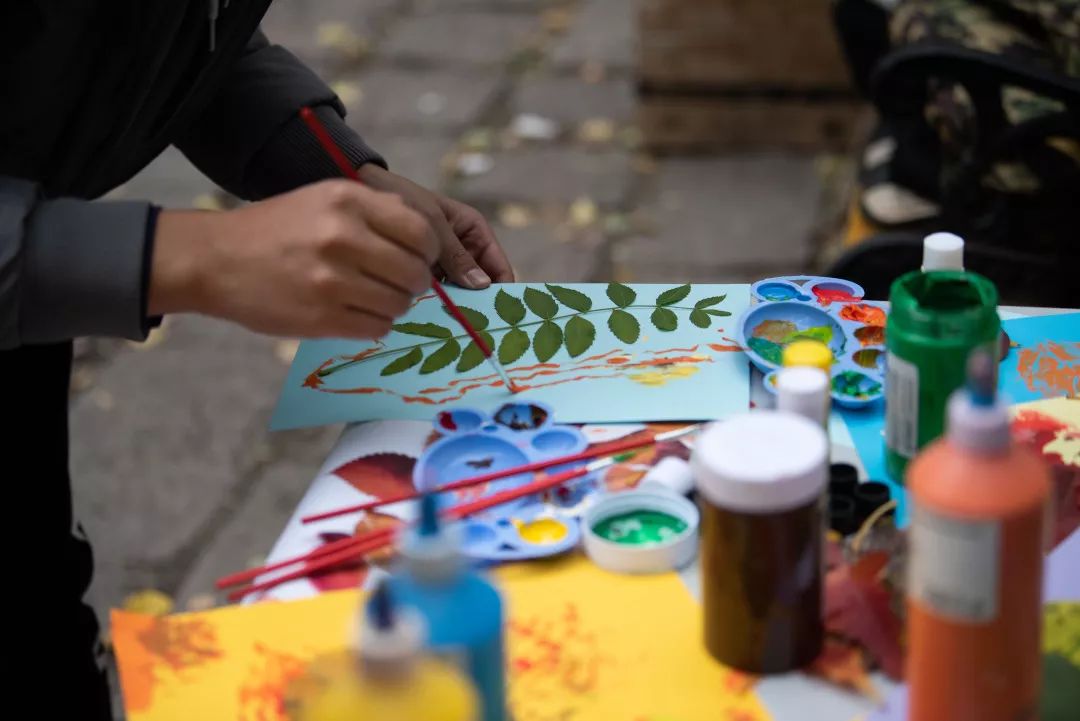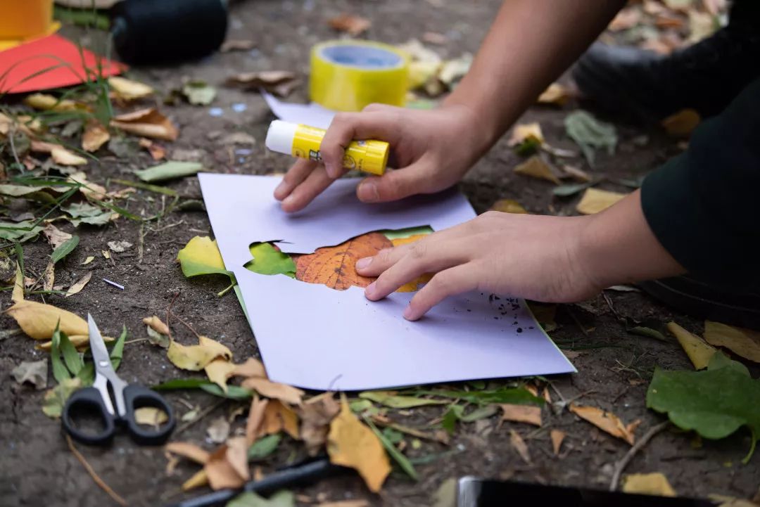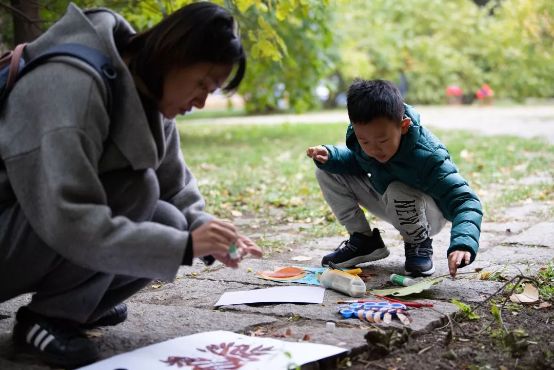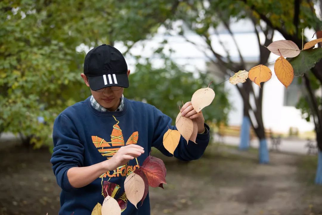 大家在场地里收集落叶,用卡纸、颜料、针线等材料纷纷开始创作。