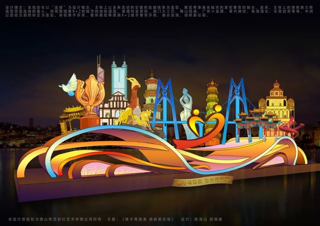 彩车《携手粤港澳 扬帆新征程》以“连接”为设计概念,立体上以多彩流动交错的连续线条为造型,通过粤港澳大湾区各个城市的地标建筑,展现大湾区紧密融合,携手发展。