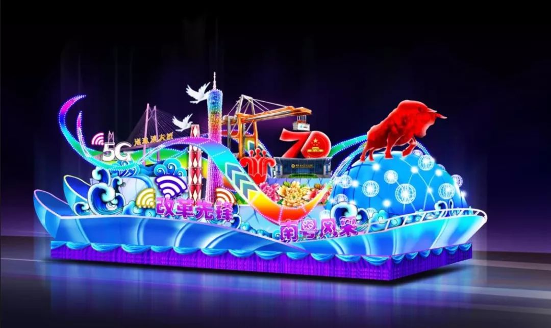 Using newly developed lighting technology, "Reform Pioneer, Guangdong Style" float is in the shape of a sailing boat, composed of Guangzhou Tower, energetic cattle, flying birds and other figures. It focuses on the brilliant achievements and development of Guangdong in the past 70 years and shows "southern Guangdong style" to the audience.