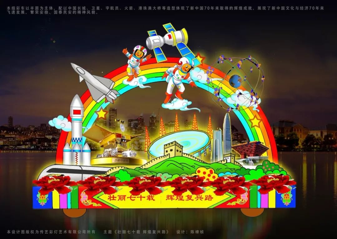 Beidou Satellite, astronaut, fighter aircraft, carrier rocket……are all parts of the this float. With beautiful rainbow as its main body, the float carries the great achievements in science and technology since the founding of PRC.