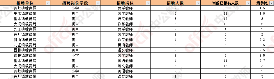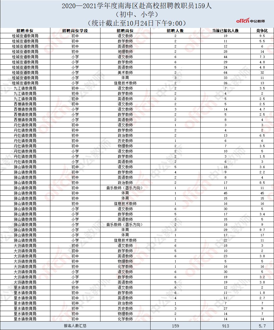 截止至10月24日21:00,竞争最激烈的岗位是狮山镇教育局的初中体育岗位,竞争比已达45:1!而报名人数最多的岗位依旧为桂城街道教育局的小学美术岗位,招2人,当前已报名人数已达64人,竞争比为32:1!