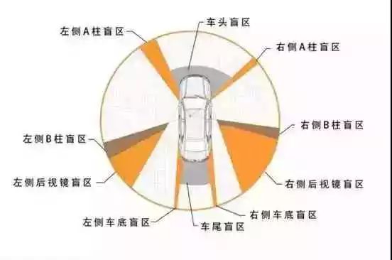 驾驶盲区主要分为车头盲区、车位盲区、后车底盲区、A柱盲区、B柱盲区、C柱盲区、后视镜盲区。其中盲区范围较大的是后视镜、A柱、车头、车尾盲区,先做一个简单介绍,下面开始具体讲解。