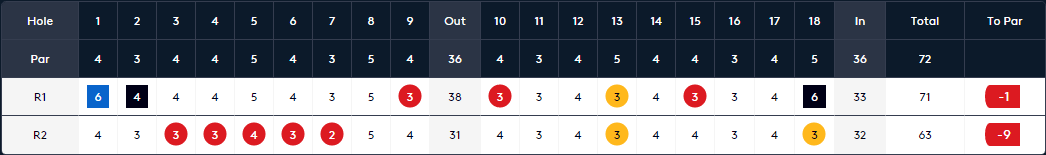 而首轮领跑的本·斯托则是后劲不足,前13个洞捉到6只小鸟的情况下他却在最后4洞丢掉3杆,最终交出69杆,与马修·乔丹和里卡多-桑图斯一道以-11的总成绩排在并列第三位。