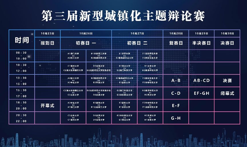 本次赛事于福建省福州市福州大学举行,从10月25日到10月30日开启一场为期6天的城镇化主题华语辩论盛会。本届比赛由清华大学、福州大学、福州市人民政府主办,清华大学中国新型城镇化研究院、福州市城乡建设局、福州大学建筑与城乡规划学院共同承办的世界性大学生辩论比赛,