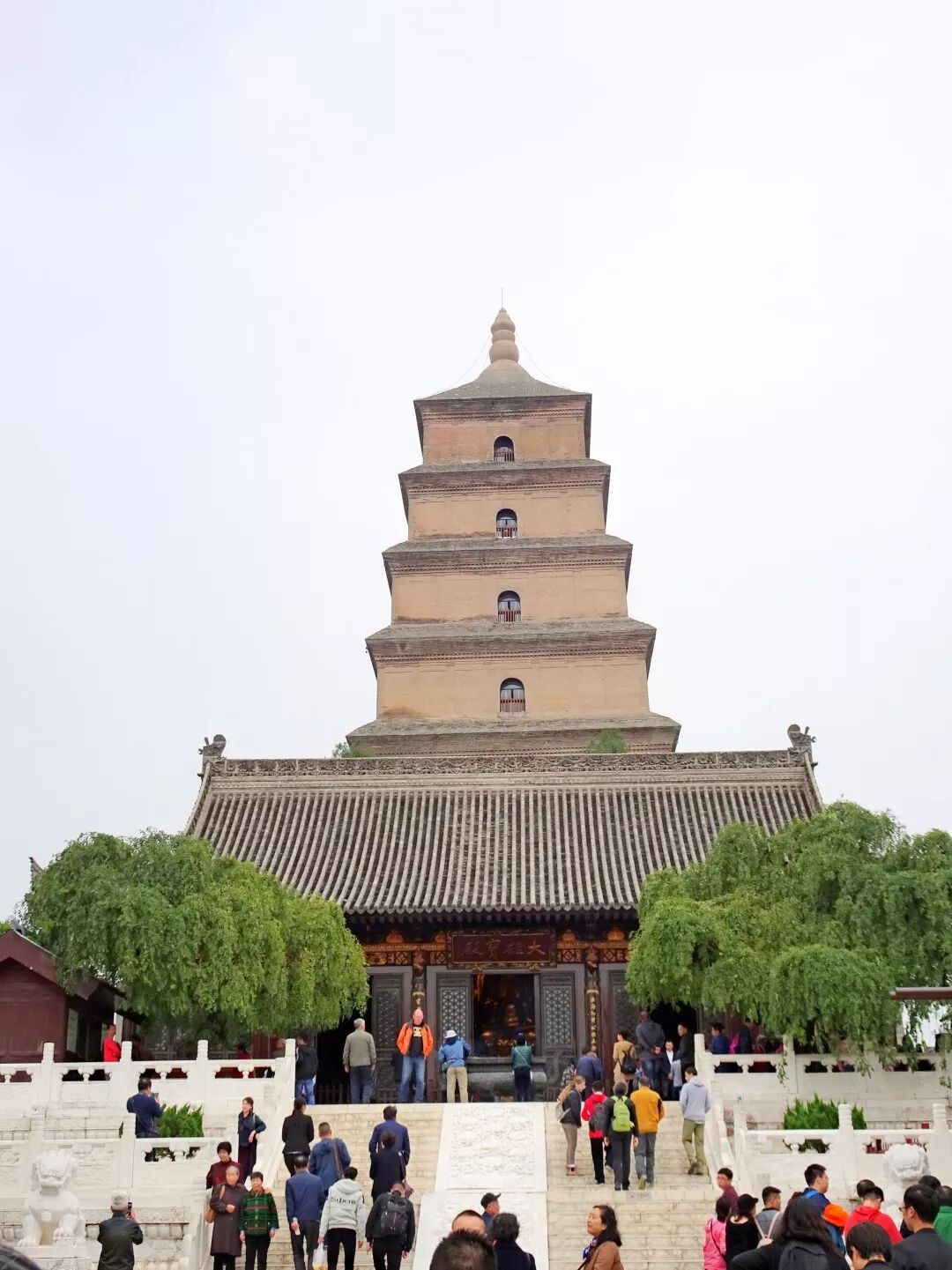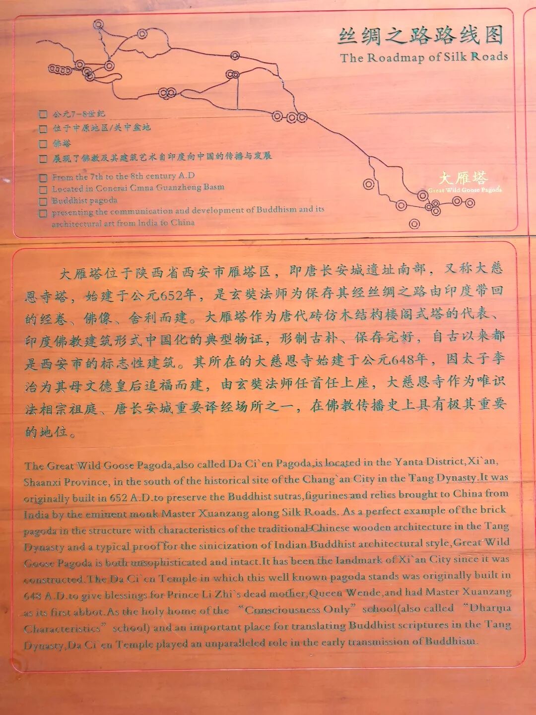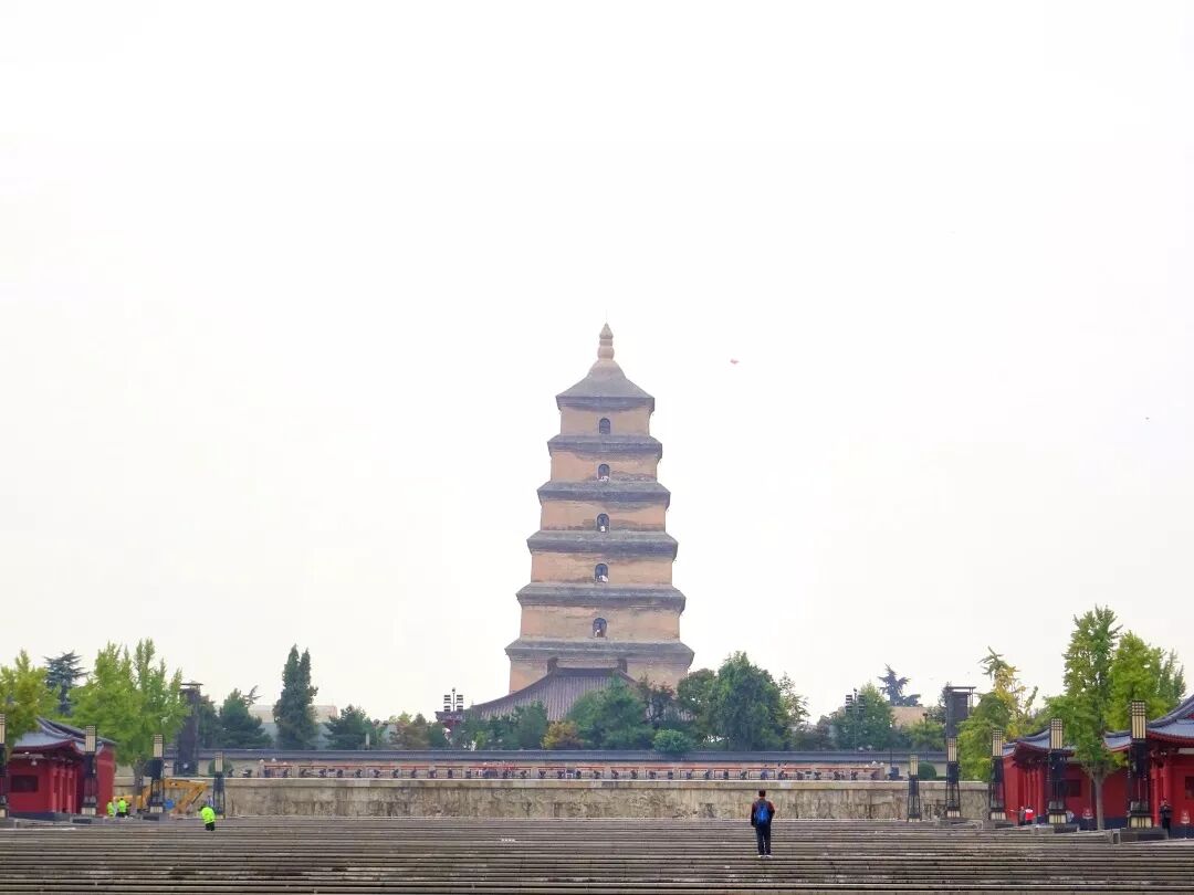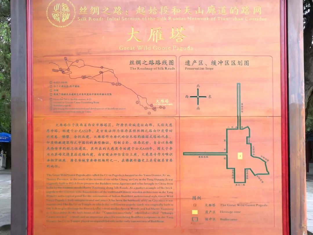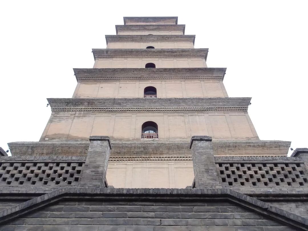 “大雁塔是唐永徽三年(652年),玄奘为保存由天竺经丝绸之路带回长安的经卷佛像主持修建了大雁塔,最初五层,后加盖至九层,再后层数和高度又有数次变更,最后固定为今天所看到的七层塔身,通高64.517米,底层边长25.5米。大雁塔作为现存最早、规模最大的唐代四方楼阁式砖塔,是佛塔这种古印度佛寺的建筑形式随佛教传入中原地区,并融入华夏文化的典型物证,是凝聚了中国古代劳动人民智慧结晶的标志性建筑。”(来源百度)