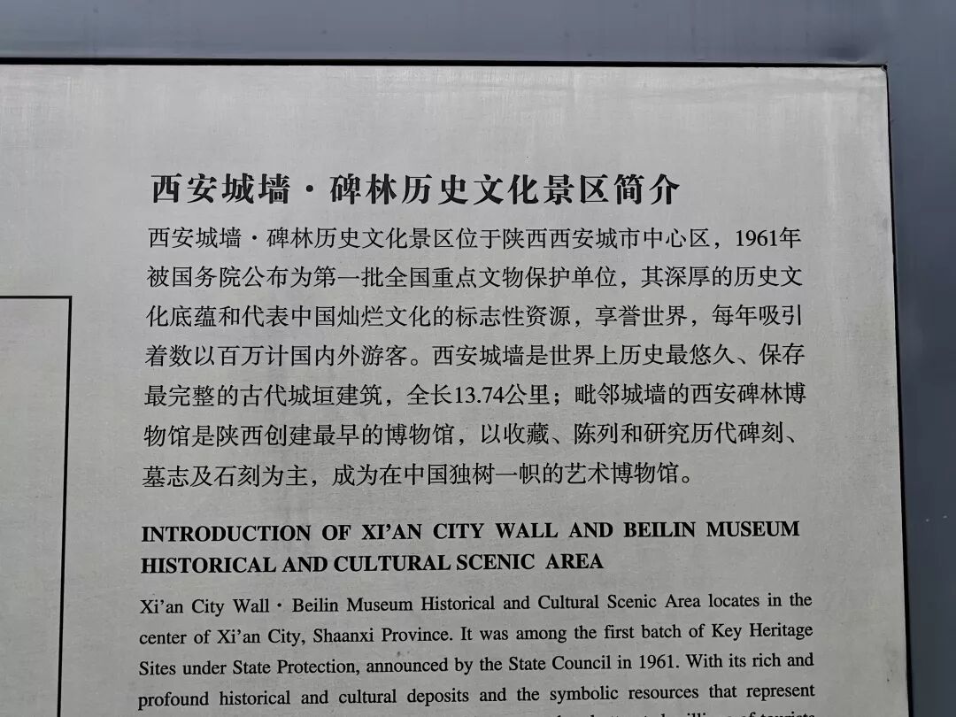 来到旅程的第四天,今天也是晴朗的一天,我们早上9点多10点起床,吃了早点之后便到了西安城墙,从名宿到城墙非常近,步行只要6~7分钟,其中,城墙的门票为?54/人,碑林博物馆为?64/人,碑林博物馆主要是展示书法刻字等,两个景点是可以一起游览,也可以分开游览